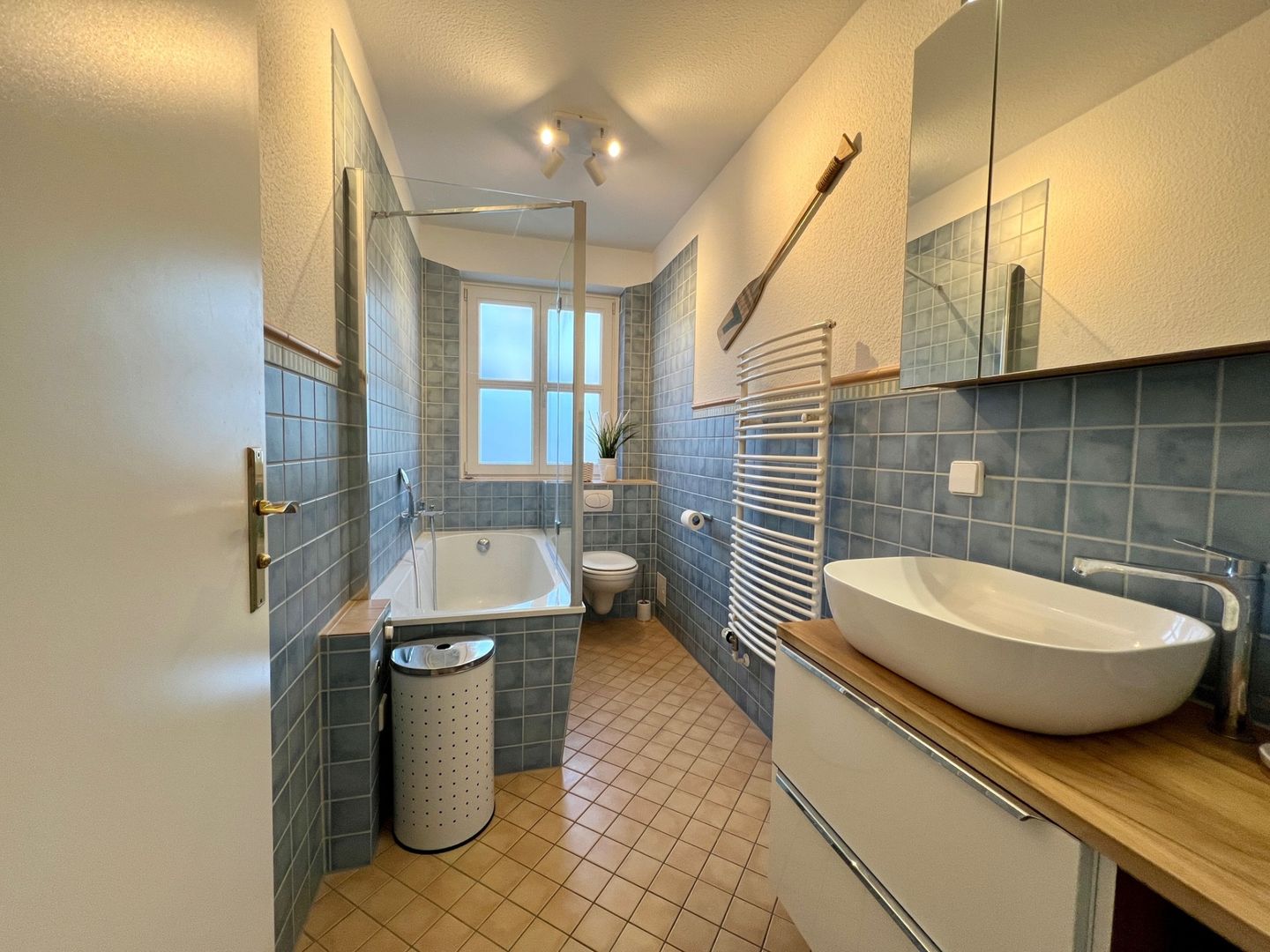 Bad: Wanne mit Glasduschabtrennung/WC, Waschtisch mit Spiegelschrank, beheizbarer Handtuchtrockner, wannenfähiger Wäscheständer